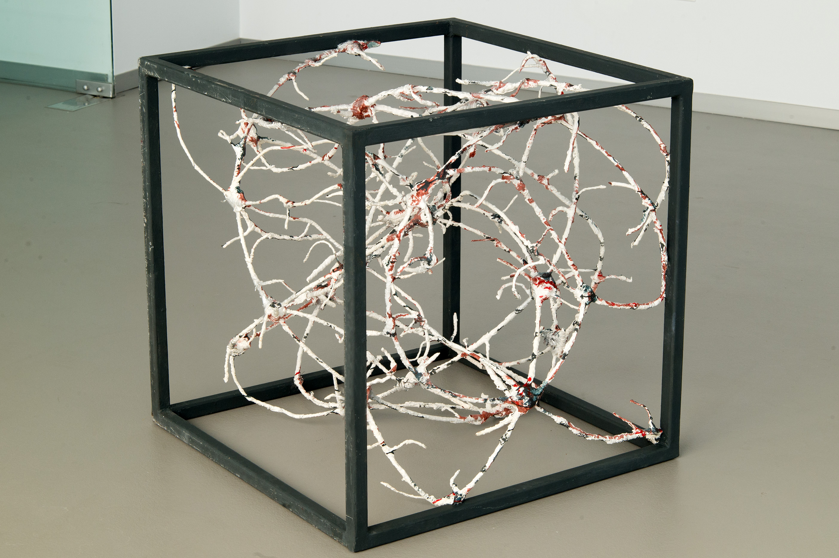 La escultura consiste en una estructura geométrica en forma de cubo ocupado por otra estructura interna que representa una red neuronal.